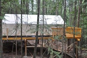 This beautiful camp site is set back from the business of the main camp a short 10 min walk to our back 20 acres. This site is designed to accommodate a group up to 40 people. The sleeping accommodations include 4 large canvas tents on raised platforms with cots for each guest. The full outdoor cooking area has four wood cook pits, covered picnic table area and counters for food prep. This is ideal for a class outtrip, youth campout or family wilderness retreat.